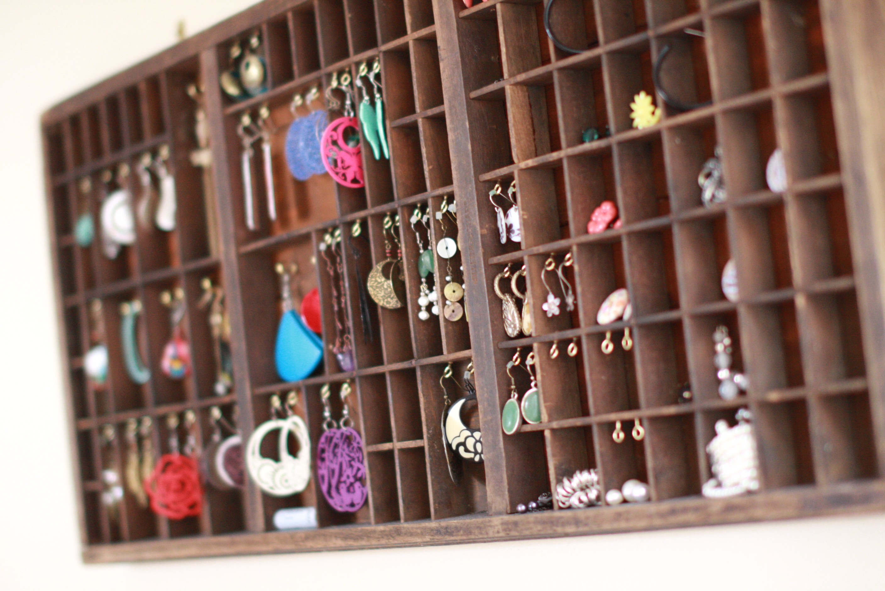 I thought i’d update folks on my type drawer efforts, considerable as they were. The mainĀ unforeseenĀ challenge was the logistic aspect of putting all the eyelets on the upper part of each square. The angles just weren’t made for such an activity. However having eventually figured out a way, i then realised all my earrings were too long for most of the squares. So now i need to find some other little trinkets to go in those slots. Overall, i was pleased with the outcome: pretty storage/display with a vintage feel. Its all good!
