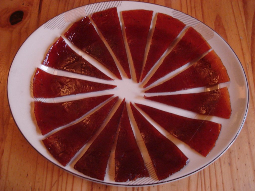 Along came another friend at a critical moment to keep me brave for the next decision when this hot pot of gorgeous gold was ready. We poured it onto flat tins lined with oiled greaseproof and placed it for a few hours in the bottom oven where I imagine meringues would crisp without going brown. Later that evening a panicky moment emerged when the top and bottom of the four trays were darkening and losing that wonderful transparent red gold glaze. It was time to rescue them and transfer to the hotpress. I found a way to stack them alongside the stacked towels and there they remained for three to four days slowly drying into what reminded me of turkish delight though in much thinner sheets. It was only then I discovered a site online that sold the spanish membrillo wrapped like the soft galtee cheese triangles that kids love.