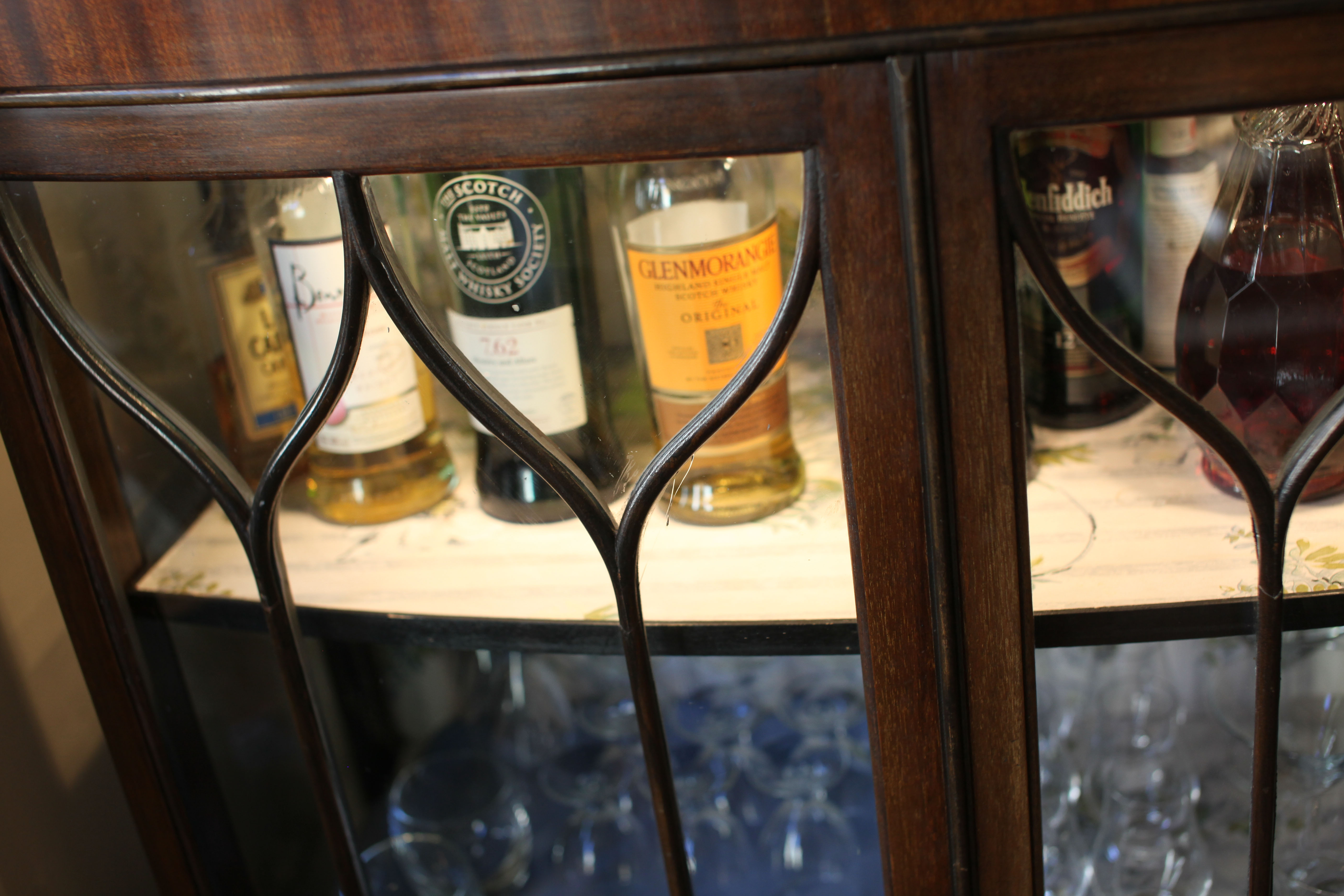 My latest project was one of the first things i bought for this house. It was a few weeks before we moved and i promised Malcolm i would find a whiskey cabinet that appealed to us both. We were headed out to North Berwick beach and we stopped off at Sam Burns place in Prestonpans. I frequent it less now than i used to as it seems to have been ‘discovered’ by a wider group and more often now i come home empty-handed, which rarely happened in the good old days. But on this merry occasion, i happened upon this delightful vintage glass cabinet. We searched around for an old bottle to make sure it would accommodate said item. This is more than i would usually do but my pal Ali brought some essential pragmatism, as is often the case. We established that bottles fitted neatly on the top shelf.
